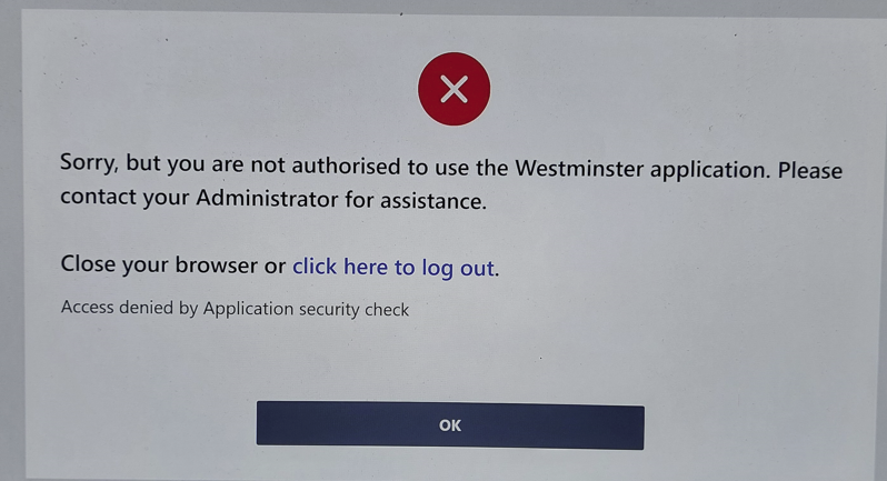 If you are seeing this screen when trying to access Westminster it means the username on your Defence Gateway account does not match the username on your Westminster record.